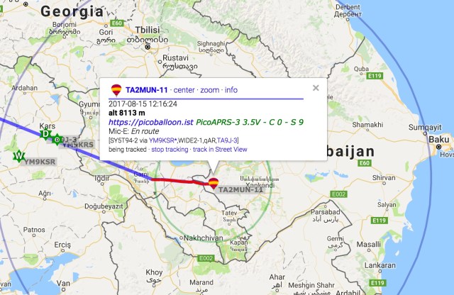 3. Gün (15Ağustos 2017) : Balonumuzdan üçüncü günde de sinyal alabildik. Aslında hiç umudum yoktu fakat gece hızı düştüğü için Türkiye’yi terk etmemişti. Bu yüzden Kars’taki Digipeater’lar sayesinde Azerbaycan’a kadar takip edebildik.