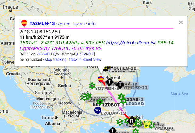 Güncelleme (1. Gün – 7 Ekim 2018) : Uçuşun ilk gününde balonumuz 9100 metre gibi gayet güzel bir yüksekliğe ulaştı ve şu an Bulgaristan yönüne doğru uçmaya devam ediyor. Yarın güneş panellere yeterince enerji verecek duruma geldiğinde Romanya’da olmasını bekliyoruz.