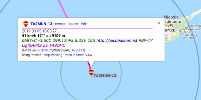 2. Gün (5 Mart 2019) : Balonumuz ikinci gününde Akdeniz’de sinyal gönderdi fakat o bölgede hava çok bulutlu olduğu ve gittiği yönde çok fazla iGate olmadığı için kısa bir süre takip edebildik. Yarından itibaren balonumuz doğuya dönecek ve çok hızlı bir şekilde yol alacak. Bir aksilik olmaz ise hafta sonuna doğru Çin’den sinyal almayı bekliyoruz.